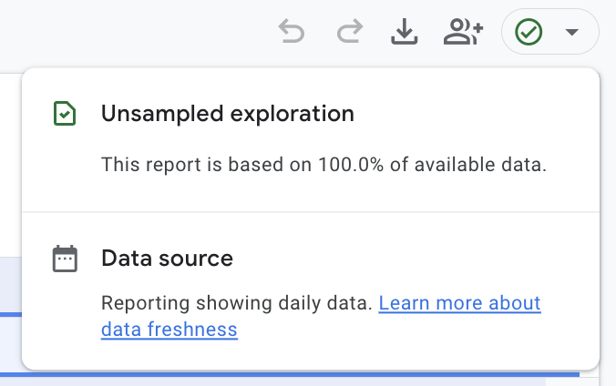 If the icon in the top-right corner of your Exploration shows yellow or orange instead of a green checkmark, your data is being sampled. GA4 activates sampling when a query exceeds approximately 10 million events.